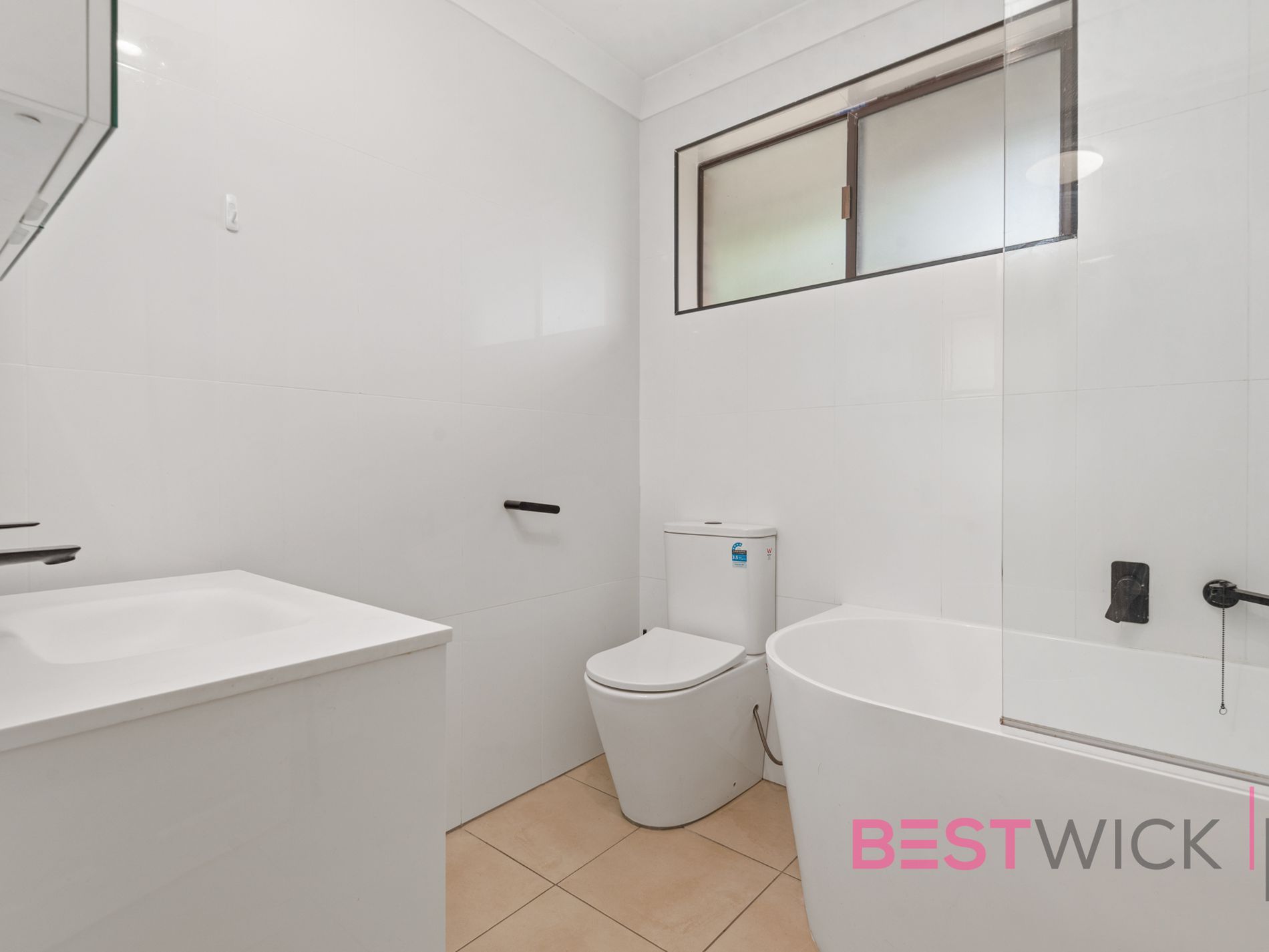 The renovated bathroom adds a fresh, modern feel to the property.